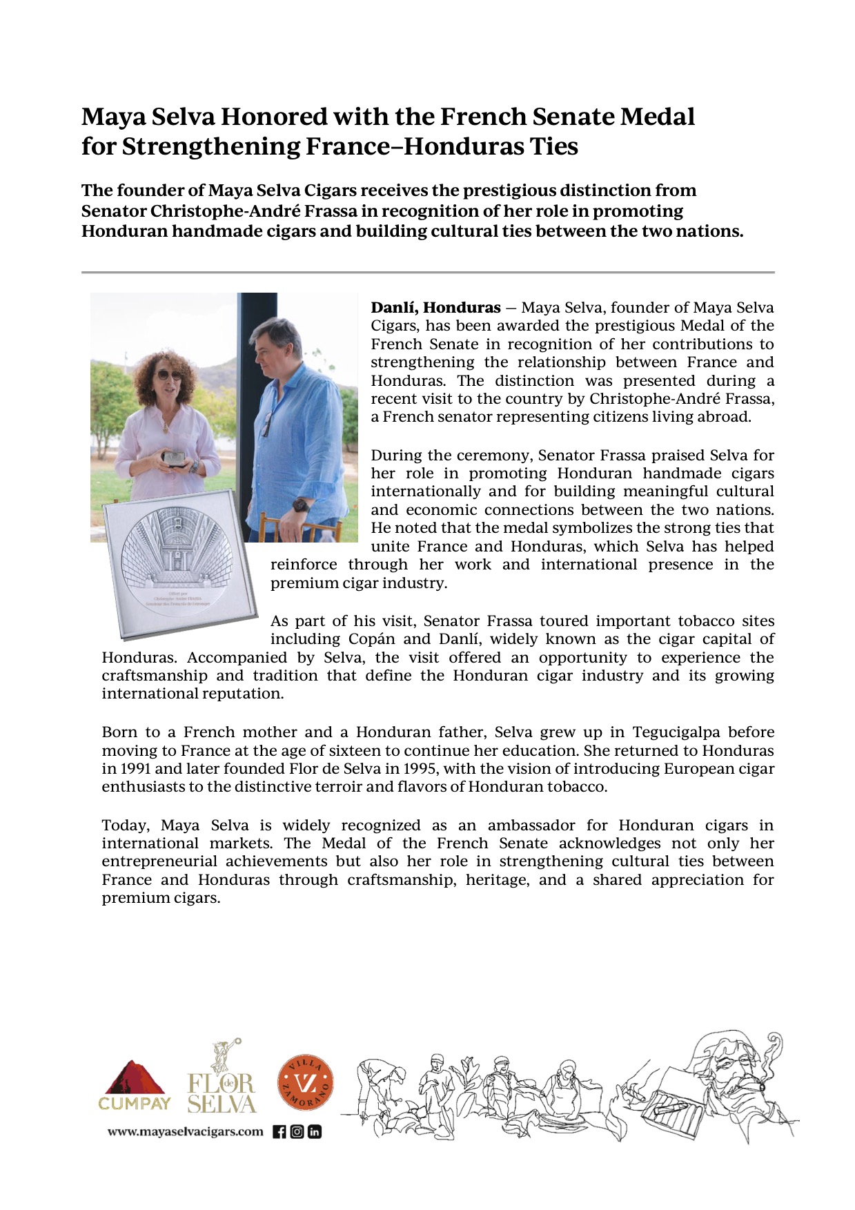 Die Gründerin von Maya Selva Cigars erhält die prestigeträchtige Auszeichnung von Senator Christophe-André Frassa in Anerkennung ihres Engagements für die Förderung honduranischer handgerollter Zigarren und den Aufbau kultureller Beziehungen zwischen den beiden Ländern.