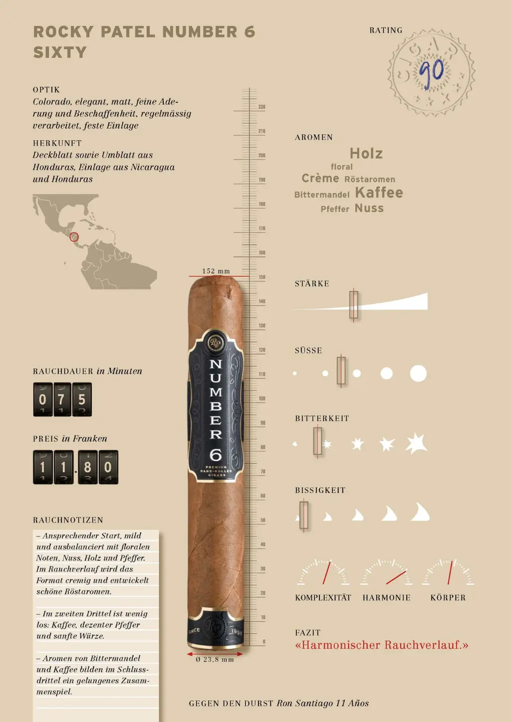 Die Rocky Patel Number 6 ist eine faszinierende Zigarre, die nicht nur durch ihren Geschmack, sondern auch durch ihren ungewöhnlichen Namen besticht. Die mittelkräftige Kreation vereint feinste Tabake aus Honduras und Nicaragua zu einem perfekt ausbalancierten Blend, umhüllt von einem seidig glänzenden Jamastrán-Deckblatt aus dem Südosten von Honduras.